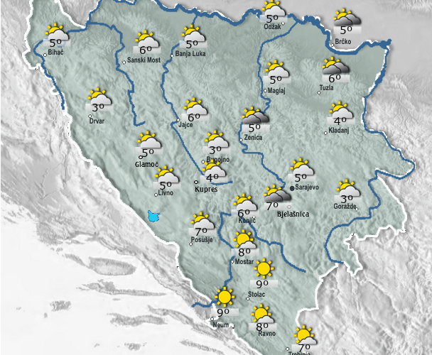 Danas u većem dijelu zemlje pretežno sunčano vrijeme. Magle i niske oblačnosti će biti po kotlinama u istočnim i centralnim područjima gdje se može zadržati tokom cijelog dana. Vjetar je slab promjenljivog smjera. Najviša dnevna temperatura zraka uglavnom između 9 i 15°C, u mjestima sa dugotrajnom maglom od 3 do 7°C.