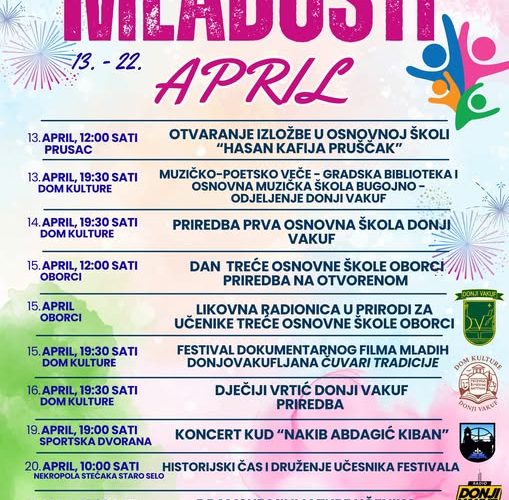 U Donjem Vakufu, od 13. do 22. aprila, održat će se „Proljetni festival mladosti“, višednevna smotra stvaralaštva djece i mladih u različitim poljima. Riječ je o nastavku tradicije festivala koji se ranije zvao „U susret proljeću“, ali obzirom da smo proljeće već prilično načeli, dali smo mu drugo ime.