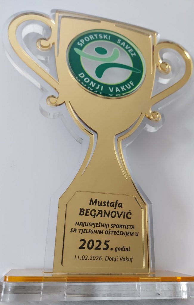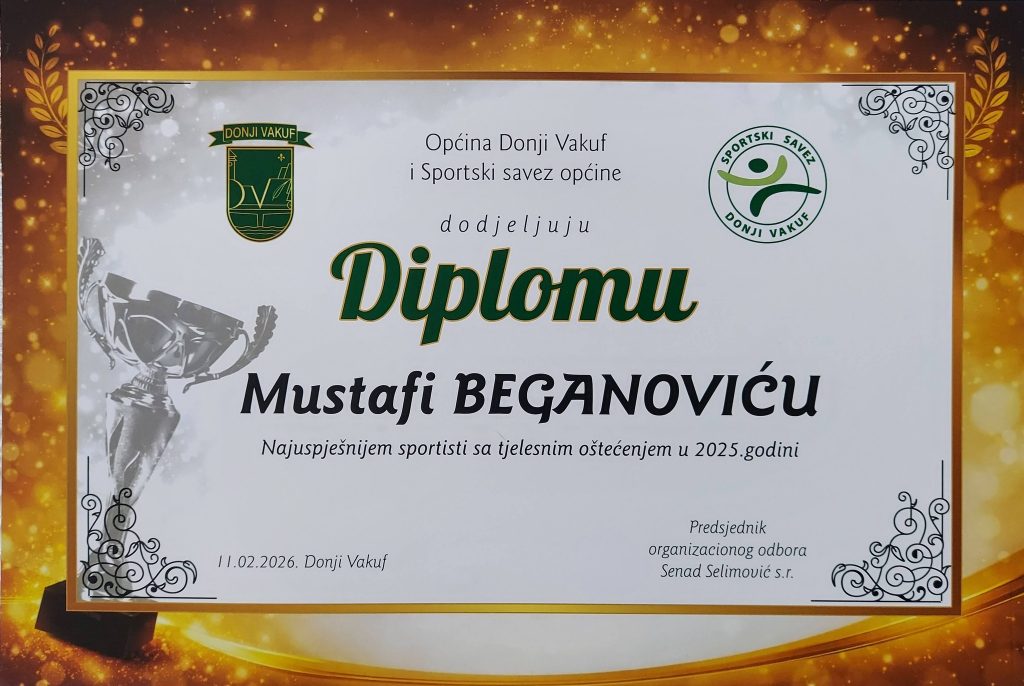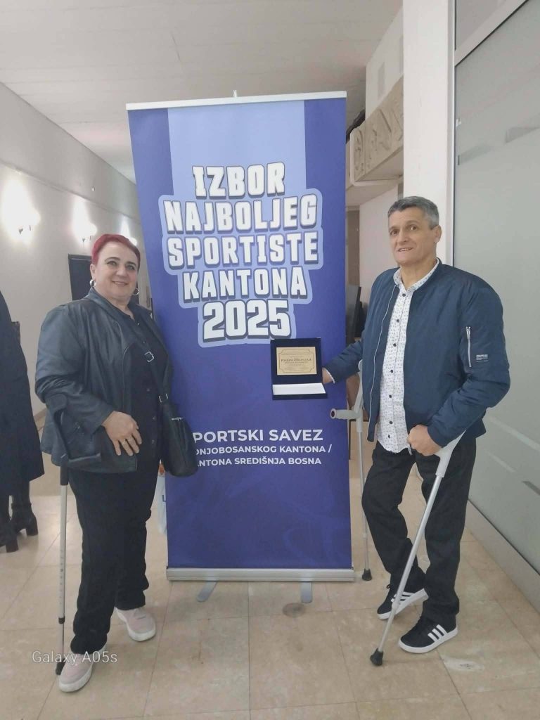 “Nakon izbora za najuspjesnijeg sportistu sa tjelesnim ostecenjem Donjeg Vakufa , uslijedilo je jos jedno priznanje i sa kantonalnog nivoa.U organizaciji Sportskog saveza SBK/KSB , uz pokroviteljstvo Ministarstva obrazovanja , nauke , mladih , kulture i sporta SBK/KSB , u opcini Jajce 13.02.2025.godine odrzana je 23. manifestacija izbora najboljeg sportiste kantona za 2025.godinu.