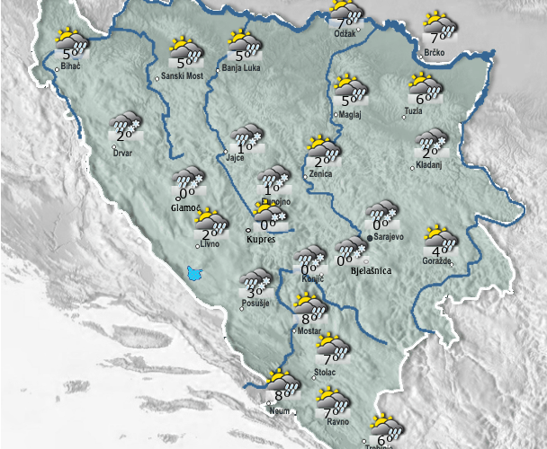 Jutros je u Bosni i Hercegovini oblačno sa kišom ili susnježicom u nizinama i snijegom u višim područjima.