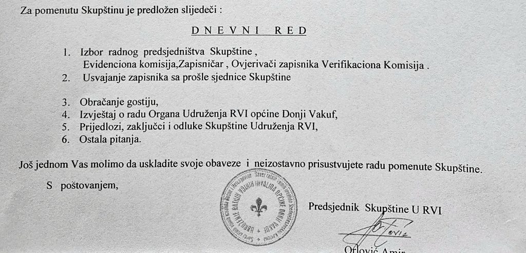 Predsjednik Skupštine Udruženja RVI Općine Donji Vakuf g.Amir Orlović je predložio dnevni red koji je jednoglasno usvojen. Sve tačke dnevnog reda ( svi izvještaji skupštinski komisija,nadzornog odbora, izvještaja Predsjednika Udruženja kao i finansijskog izvještaja ) su jednoglasno usvojene i time je data maksimalna podrška radu Udruženja na čelu sa Predsjednikom zlatnim ljiljanom Fadilom Sole.