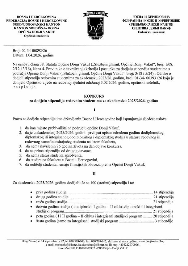 Donji Vakuf, VijestiDonji Vakuf – Općina Donji Vakuf – Konkurs za dodjelu stipendija redovnim studentima za akademsku 2025/26. godinu 2 Aprila, 2026 Izvor: Općina Donji Vakuf X Exit full screen gallery ⇗ Open full size image → Next image 0 of 0 ← Previous image Like this:Like Loading...