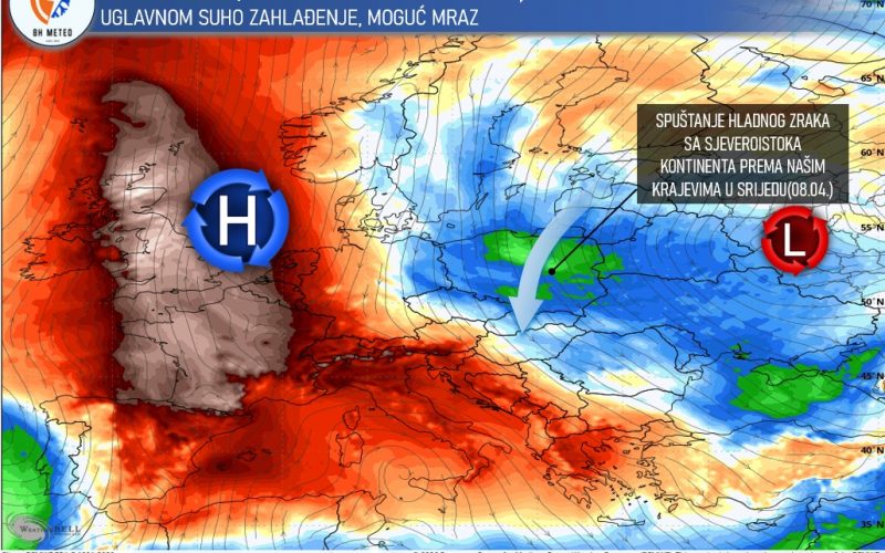 Radi se o uglavnom suhom zahlađenju, pa bi se tako u srijedu i četvrtak(09.04.) nastavilo pretežno sunčano vrijeme ali uz niže temperature u odnosu na one kakve smo imali na početku sedmice. Od srijede dnevne temperature od 9 do 15, lokalno do 18 °C uz slab do umjeren sjeverni i sjeveroistočni vjetar. Jutra hladna uz lokalno mraz.