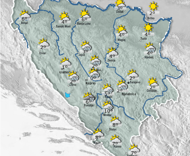 Danas u Bosni i Hercegovini sunčano uz umjerenu oblačnost. Nešto više oblaka očekuje se u južnim i jugozapadnim područjima. U drugoj polovini dana se očekuju i slabi kratkotrajni lokalni pljuskovi. Vjetar je slab do umjerene jačine južnog i jugoistočnog smjera. Jutarnja temperatura zraka većinom između 0 i 5, na jugu zemlje do 8, a najviša dnevna temperatura zraka uglavnom između 14 i 19 stupnjeva.