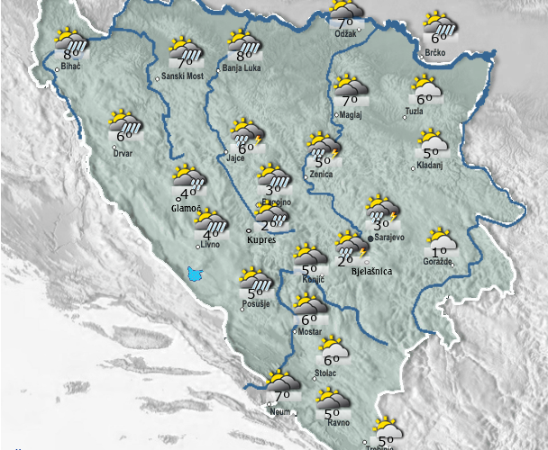 Danas u Bosni i Hercegovini umjereno do pretežno oblačno i nestabilno vrijeme sa lokalnim pljuskovima. Padavine su češće u drugoj polovini dana. Vjetar je slab južnog smjera. Najviša dnevna temperatura zraka uglavnom između 12 i 18 stupnjeva