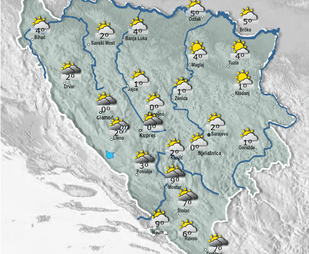 Danas će u Bosni i Hercegovini preovladavati umjereno do pretežno oblačno vrijeme. Poslije podne lokalno je moguća slaba kiša. Vjetar slab do umjeren istočni i sjeveroistočni. Dnevna temperatura zraka od 8 do 14, na jugu i sjeveru zemlje do 16 °C.