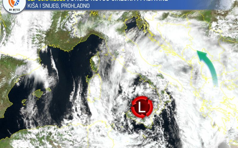 Od danas počinje uticaj novog ciklona koji se smjestio sa centrom nad jugom Italije. Nama neće donijeti neku bitniju promjenu vremena u odnosu na prethodne dane, ostaje većinom oblačno, tmurno i prohladno vrijeme uz padavine.