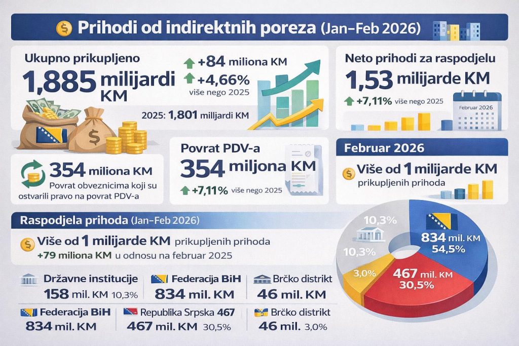 UIO BIH danas je objavila kako su prihodi od indirektnih poreza u prva dva mjeseca 2026. godine iznosili su 1 milijardu i 885 milion KM.Za finansiranje državnih institucija u prva dva mjeseca 2026. godine raspoređen je iznos od 158 miliona KM, a višak prikupljenih prihoda završio je u entitetskim kasama i kod Brčko distrikta.