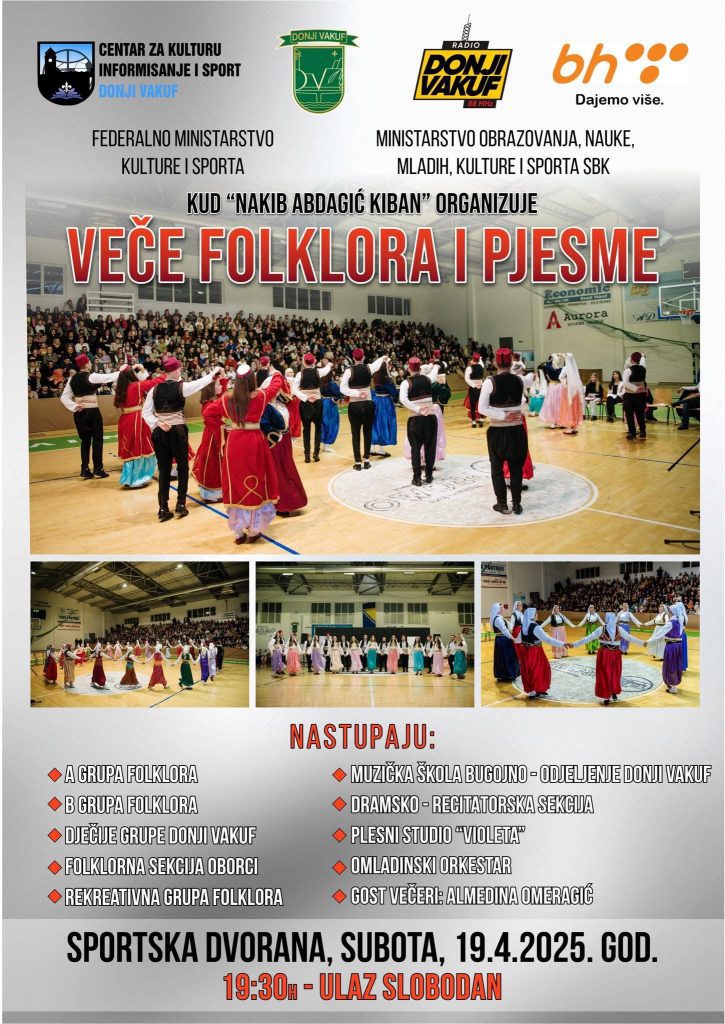KUD “Nakib Abdagić – Kiban” organizuje veče folklora i pjesme. Manifestacija će se održati u subotu, 19.04.2025. u Sportskoj dvorani u Donjem Vakufu sa početkom u 19:30h. Ulaz je slobodan.