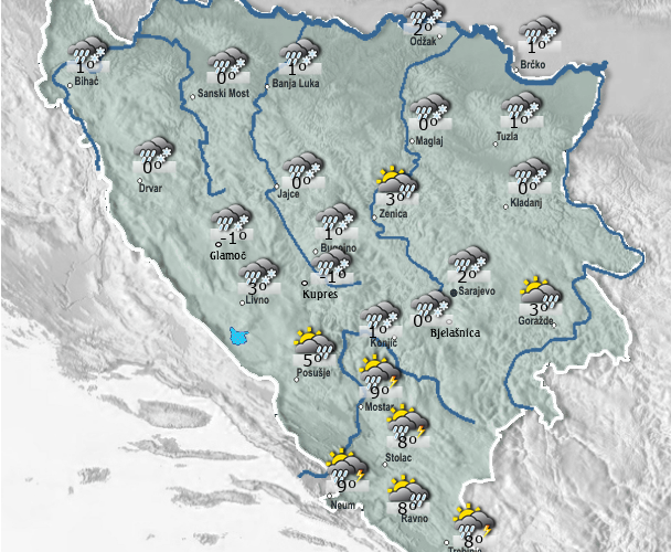 U Sarajevu oblačno sa kišom i susnježicom koji mogu preći u snijeg. Najviša dnevna temperatura zraka oko 3°C.