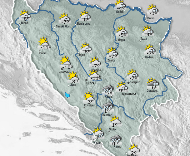 Jutro pretežno oblačno, uz postepeno razvedravanje tokom dana. U jutarnjim satima i dio prijepodneva slab snijeg je moguć u Bosni i na sjeveru Hercegovine. Na jugu i jugozapadu umjerena bura, a u ostatku zemlje slab do umjeren zapadni i sjeverozapadni vjetar. Jutarnja temperatura zraka od -11 do -4, na sjeverozapadu Bosne do -14, na jugu od -1 do 3, a dnevna od -6 do 0, na jugu do 6 °C.