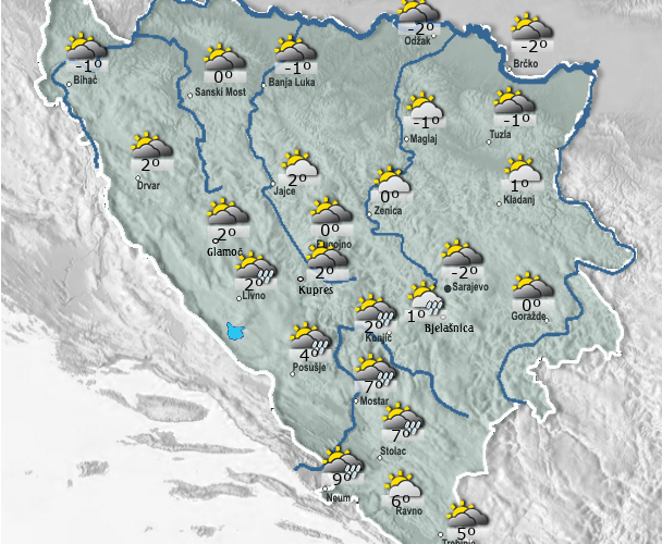 Danas djelomično vedro sa slabom kišom većinom na području Hercegovine i jugozapadu Bosne. U većem dijelu Bosne lokalno može pasti slaba kratkotrajna kiša. Vjetar je slab južnog i jugoistočnog smjera. Najviša dnevna temperatura zraka uglavnom između 1 i 6°C, na jugu zemlje od 8 do 12°C.