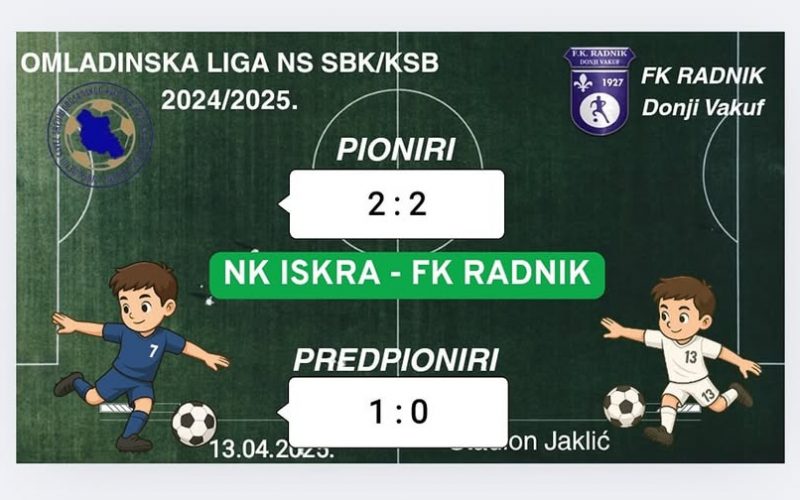 Pionirska selekcija je danas odigrala neriješeno, iako su dva puta imali prednost, golovima Vedada Janjoša, u 18 minuti, i Hamze Šego, u 60 minuti, domaća ekipa je oba puta uspjela izjednačiti.