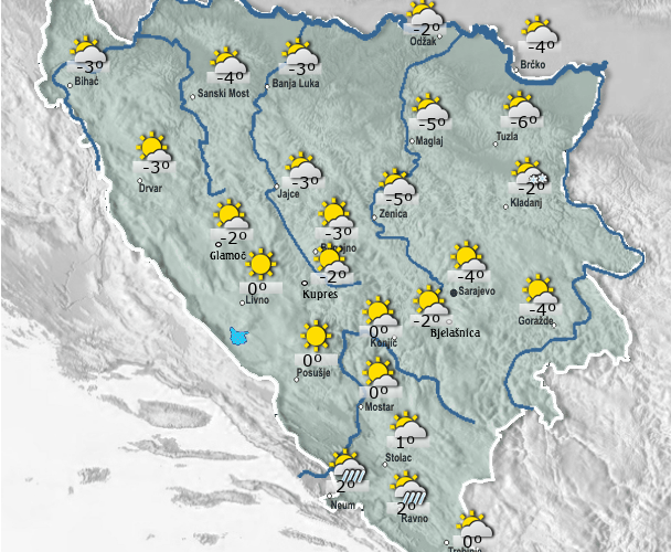 Danas če u Bosni i Hercegovini preovladavati sunčano vrijeme uz umjeren porast naoblake tokom dana. Poslije podne i tokom noći ponegdje u centralnim i istočnim područjima Bosne je moguć slab snijeg. Na jugu i jugozapadu umjerena do pojačana bura, a u ostatku zemlje slab do umjeren sjeverni i sjeverozapadni vjetar. Dnevna temperatura zraka od -2 do 4, na jugu od 6 do 12 °C.