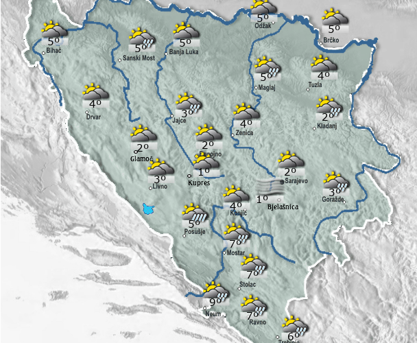 U ponedjeljak 9.2.2026. u Bosni i Hercegovini pretežno oblačno vrijeme. Povremeno će padati slaba kiša. Na vrhovima planina može padati i slab snijeg. Vjetar je slab do umjerene jačine istočnog smjera. Najniža jutarnja temperatura zraka većinom između 2 i 6°C, na jugu do 8°C. Najviša dnevna temperatura zraka uglavnom između 6 i 11°C, na jugu zemlje do 13°C.