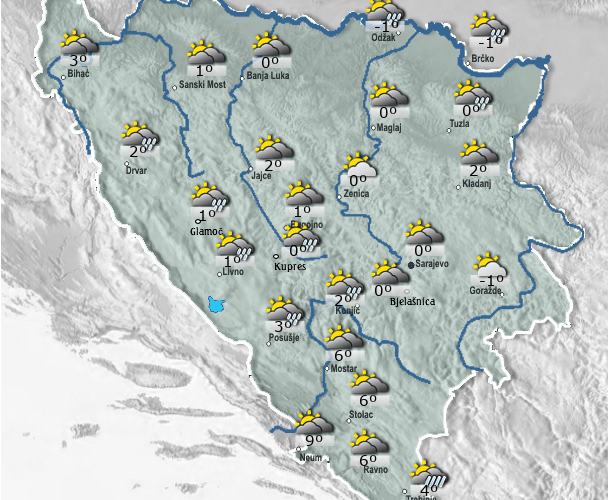 Danas u Bosni i Hercegovini umjereno do pretežno oblačno vrijeme. Po kotlinama i uz riječne tokove moguća je magla ili niska oblačnost. Tokom dana, naoblačenje sa zapada će u poslijepodnevnim i večernjim satima uvjetovati kišu uglavnom u Hercegovini, Krajini i na jugozapadu Bosne. U većem dijelu Bosne može pasti malo kiše. Vjetar umjerene jačine, povremeno sa jakim udarima, južnog i jugoistočnog smjera. Jutarnja temperatura zraka većinom između -3 i 3, na jugu zemlje do 6, a najviša dnevna temperatura zraka između 6 i 13 stupnjeva.