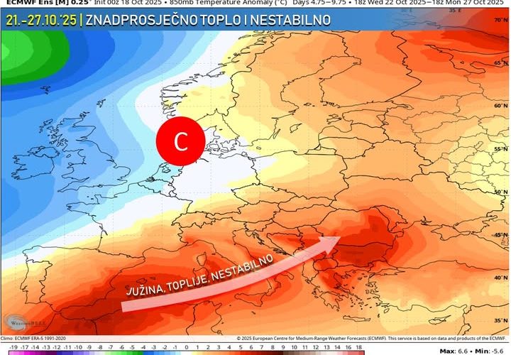 Od utorka (21.10.) očekuje se južina i toplije, ali nestabilno vrijeme.