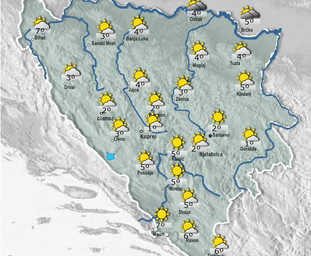 Danas će u našoj zemlji preovldaavati sunčano vrijeme. Prije podne po kotlinama centralne, istočne i sjeverne Bosne magla ili niska oblačnost. Vjetar slab zapadni i jugozapadni. Dnevna temperatura zraka od 12 do 18 °C.