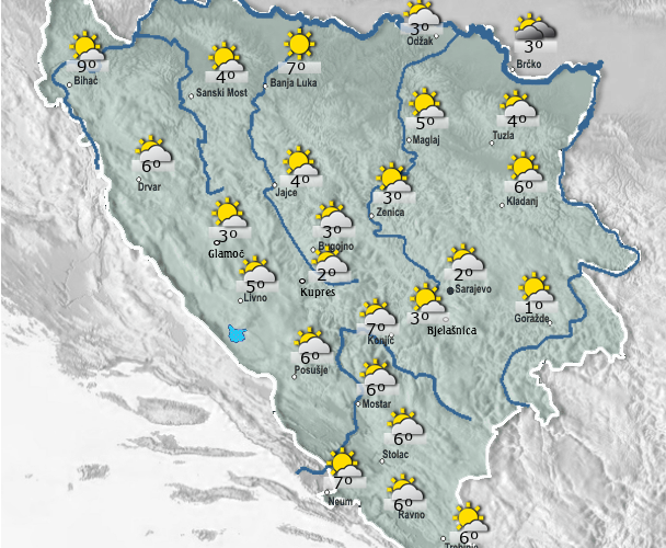 Danas će u Bosni i Hercegovini preovladavati sunčano vrijeme uz malu do umjerenu oblačnost. Prije podne po kotlinama Bosne i uz riječne tokove magla i niska naoblaka. Vjetar slab uglavnom južni i jugozapadni. Dnevna temperatura zraka od 14 do 20 °C.