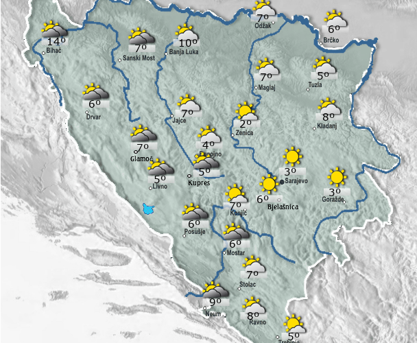 Danas će u Bosni i Hercegovini preovladavati sunčano vrijeme uz umjerenu oblačnost. Dio prijepodneva po kotlinama Bosne i uz riječne tokove magla. Vjetar slab uglavnom južni i jugozapadni. Dnevna temperatura zraka od 14 do 20, u sjevernim područjima Bosne do 22 °C.