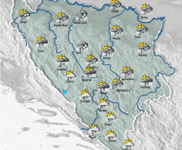 Danas se na jugu i jugozapadu zemlje očekuje sunčano vrijeme uz umjerenu oblačnost, a u ostatku zemlje pretežno oblačno. U nižim područjima Bosne povremeno je moguća slaba kiša ili susnježica, a u višim slab snijeg. Vjetar slab do umjeren sjeverni i sjeveroistočni. Jutarnja temperatura zraka od -2 do 4, na jugu do 8, a dnevna od 0 do 6, na jugu od 8 do 14 °C.