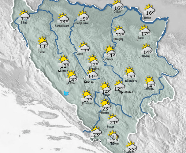 Danas u Bosni i Hercegovini umjereno do pretežno oblačno vrijeme. U poslijepodnevnim satima lokalni pljuskovi i grmljavina se očekuju na području Hercegovine, jugozapadne, centralne i istočne Bosne. Vjetar slab sjevernog i sjeveroistočnog smjera. Jutarnja temperatura zraka većinom između 10 i 16, na jugu zemlje do 19, a najviša dnevna temperatura zraka uglavnom između 26 i 31, na jugu zemlje do 34 stupnja.
