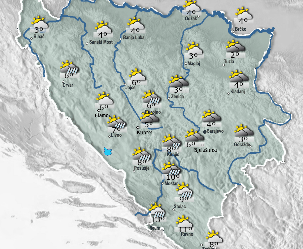 Danas u Bosni i Hercegovini umjereno do pretežno oblačno vrijeme. Prije podne po kotlinama će biti magle. Povremeno slaba kiša će padati uglavnom na području Hercegovine, Krajine i jugozapadu Bosne. Jače padavine koje dolaze sa zapada se očekuju tokom noći na petak. Vjetar je slab do umjerene jačine južnog smjera. Najviša dnevna temperatura zraka uglavnom između 10 i 15°C.