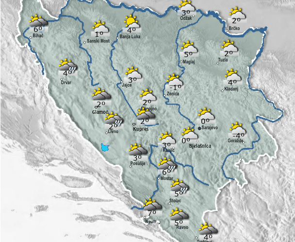 Danas se u našoj zemlji očekuje umjereno do pretežno oblačno vrijeme. U centralnim, istočnim i sjevernim područjima Bosne djelimično razvedravanje. Ponegdje u Hercegovini i na jugozapadu Bosne je moguća slaba kiša ili rosulja. Vjetar slab južni i jugozapadni. Jutarnja temperatura zraka od -2 do 4, na jugu i sjeveru do 7, a dnevna od 4 do 10, u sjevernim područjima Bosne do 12 °C.