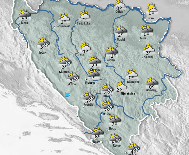 Danas se u Bosni i Hercegovini očekuje umjerno do pretežno oblačno vrijeme. Tokom dana sa kišom. Padavine se uglavnom očekuju na području Hercegovine, zapadu i jugozapadu Bosne. U većem dijelu Bosne slabije padavine. Vjetar je slab do umjerene jačine južnog i jugoistočnog smjera. Najviša dnevna temperatura zraka uglavnom između 5 i 10, na jugu do 12 stupnjeva.