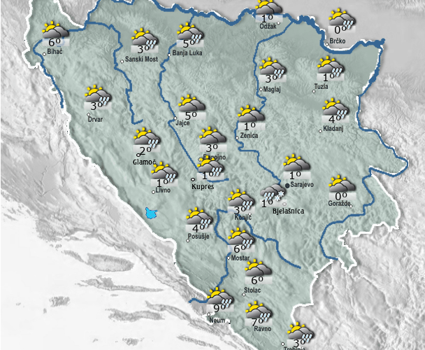 Danas u našoj zemlji jače naoblačnje sa zapada će uvjetovati kišu. Glavnina padavina je na području Hercegovine i jugozapadu Bosne. U većem dijelu Bosne slabije padavine. Vjetar je umjerene jačine, povremeno sa jakim udarima, južnog smjera. Najviša dnevna temperatura zraka uglavnom između 7 i 13 stupnjeva.